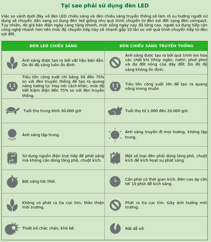Một số thông tin hữu ích dưới đây trích lại từ hãng vinaled cho bạn cái nhìn khái quát về sự khác nhau cũng như ưu nhược điểm của đèn LED so với đèn chiếu sáng thông thường.