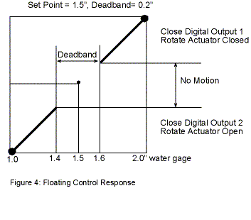 Khi biến đo lường có giá trị nằm trong vùng không tác động hoặc vùng trung lập, tín hiệu đầu ra không được kích hoạt và cơ quan điều chỉnh cũng không thay đổi – nó vẫn giữ nguyên vị trí của mình. Để cho có chế phản hồi điều chỉnh này ổn định, các bộ cảm biến phải cảm nhận được các tác động từ sự dịch chuyển cơ quan điều chỉnh một cách nhanh chóng. Điều chỉnh kiểu phao nổi không hoạt động tốt ở nơi có độ trễ nhiệt động lực đáng kể trong vòng điều khiển. Vòng điều khiển nhanh phía không khí airside phản ứng tốt với điều chỉnh kiểu phao. Một ví dụ về điều chỉnh kiểu phao nổi được thể hiện trong hình 4.