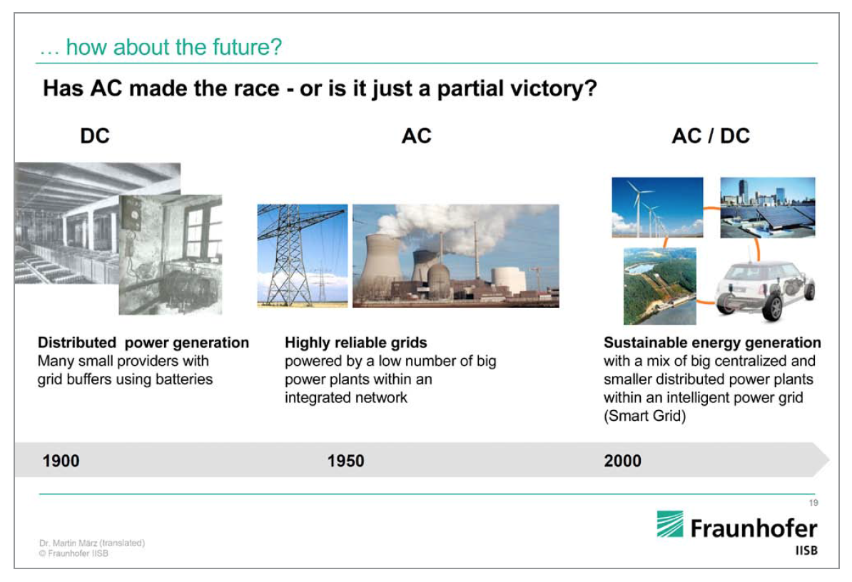 Tuy nhiên, ngày nay, trong kỷ nguyên bùng nổ của đèn LED, các nhà khoa học từ Fraunhofer Institute lại đề xuất trở lại vấn đề AC hay DC. Với đèn LED và kỷ nguyên bán dẫn, có vẻ như lưới điện DC có nhiều thuận lợi hơn.
